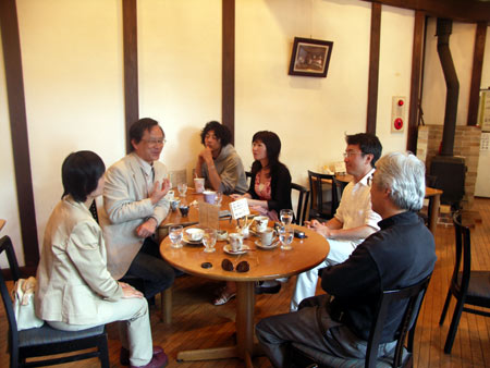 参考館近くのカフェで一休み.でもやっぱり2時間ほどの『どこでも”民知の会”』でした.photo:Furubayashi